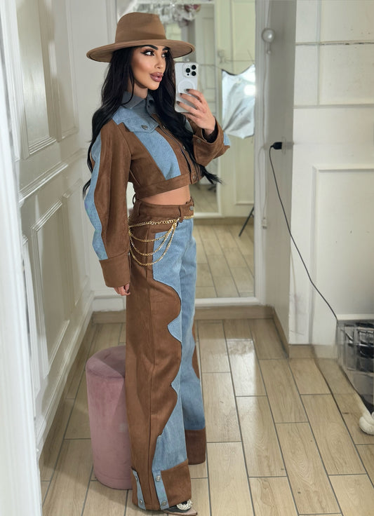 Ordinato Denim e camoscio taglia S e M la modella indossa la S
