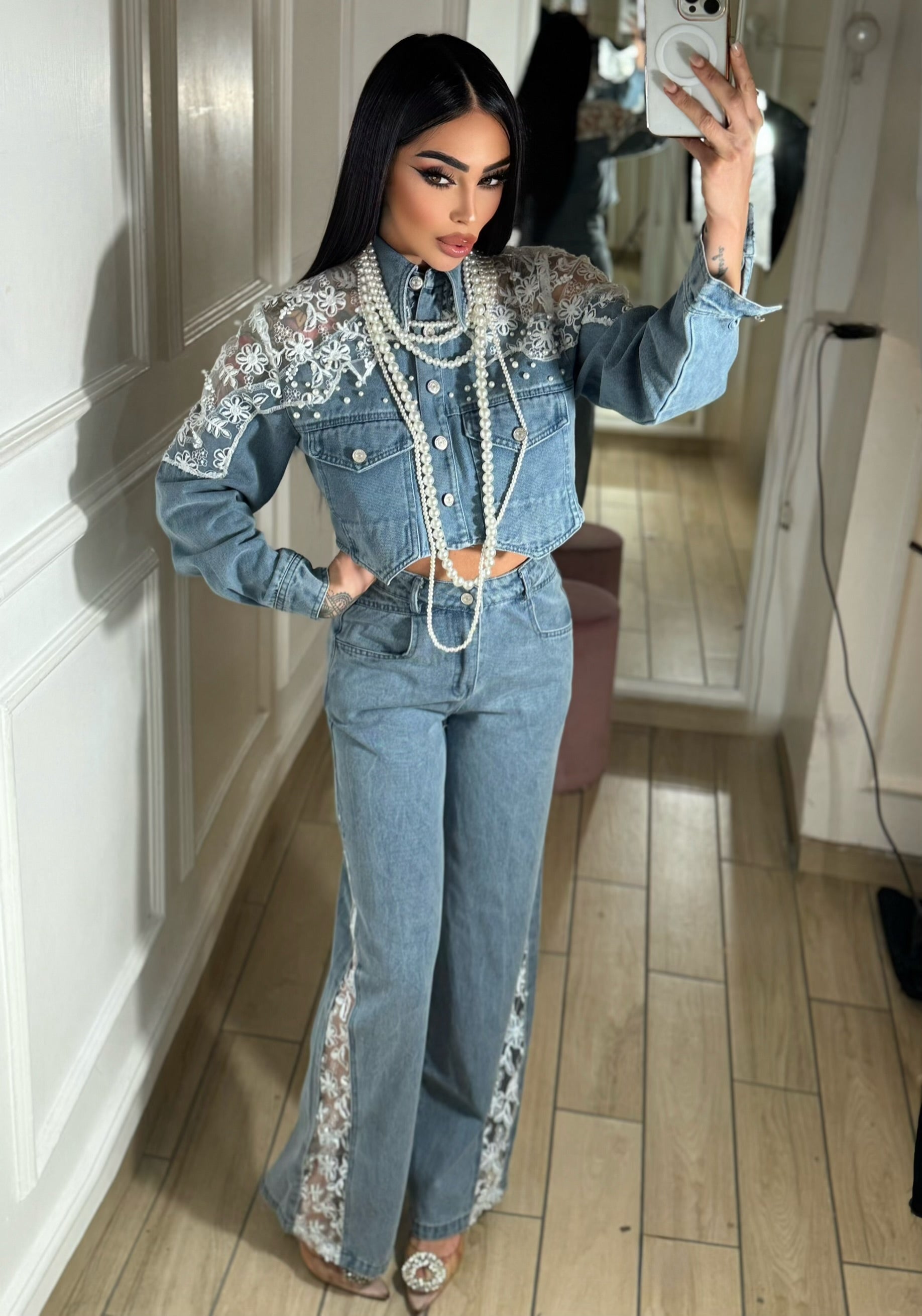 Coordinato in Denim dalla S alla XL la modella indossa S