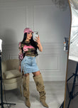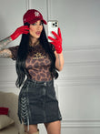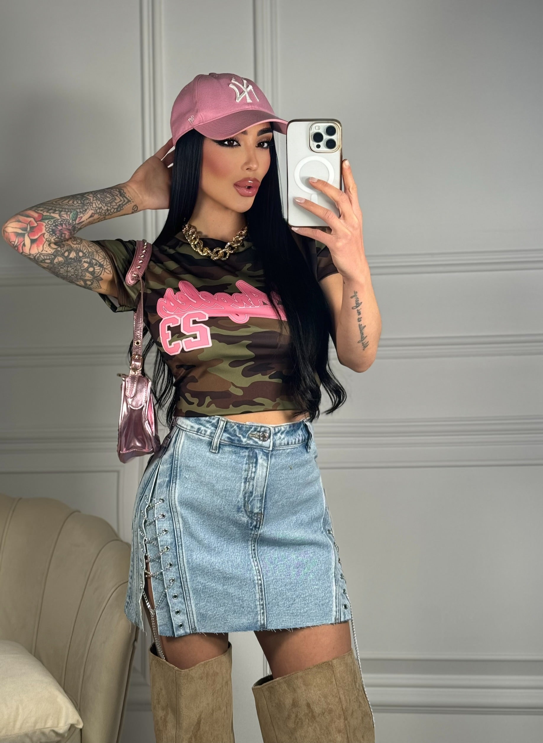 Minigonna in denim con catene ai lati e spacchetti laterali.